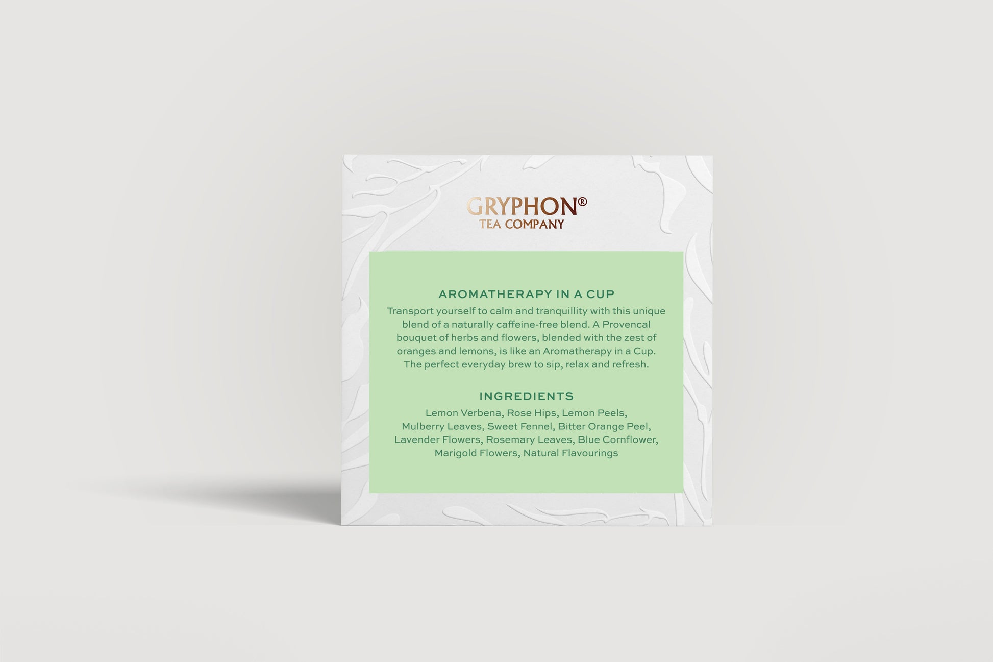 Promotes a Healthy Mood Transport yourself to calm and tranquillity with this unique blend of a naturally caffeine-free blend. A Provencal bouquet of herbs and flowers, blended with the zest of oranges and lemons, is like an Aromatherapy in a Cup. The perfect everyday brew to sip, relax and refresh. Gryphon's Aromather