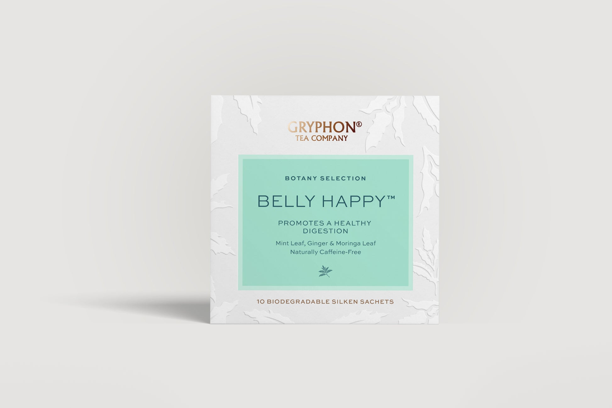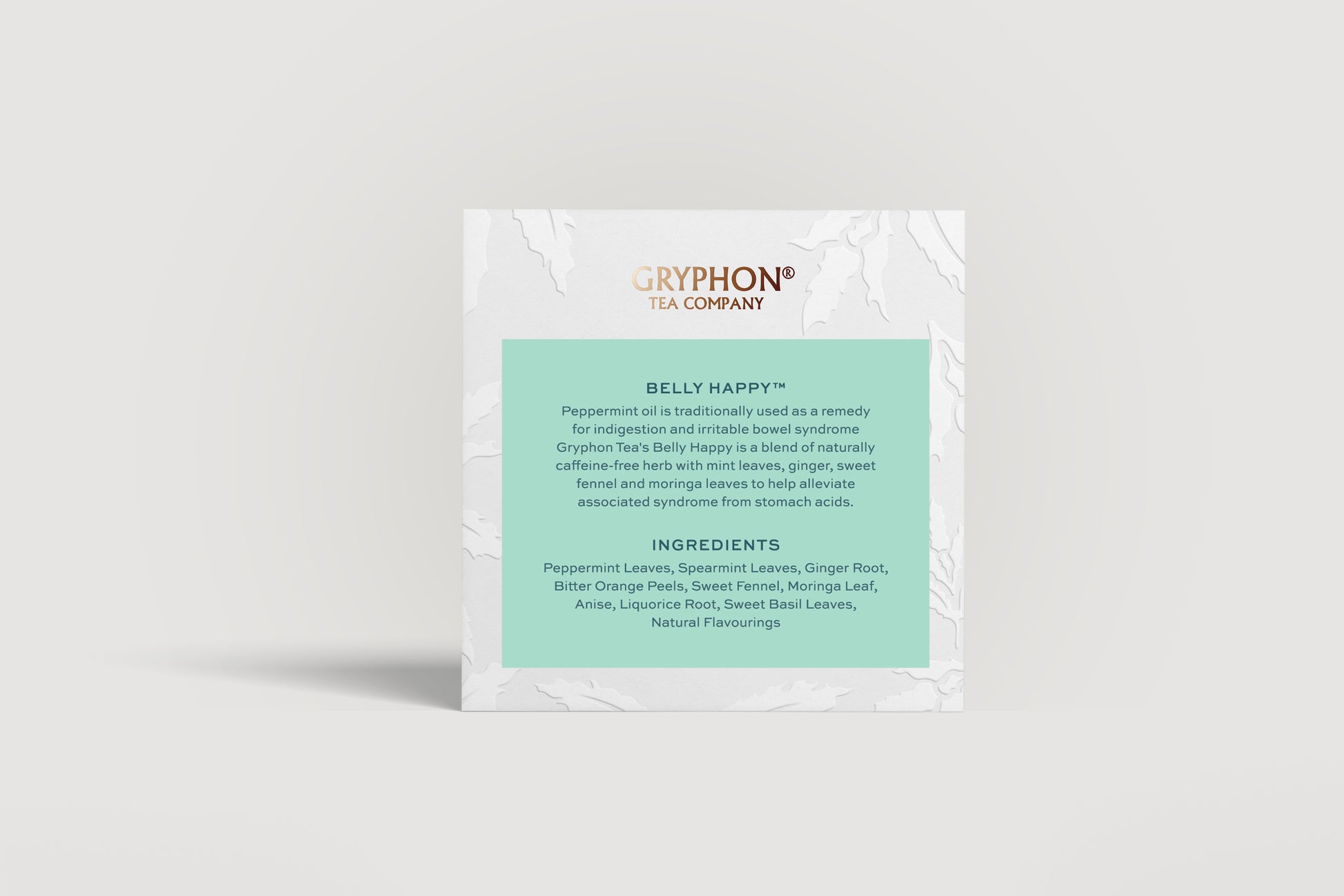 Promotes a Healthy Digestion Peppermint oil is traditionally used as a remedy for indigestion and irritable bowel syndrome. Gryphon Tea's Belly Happy is a blend of naturally caffeine-free herbs with Mint Leaves, Ginger, Sweet Fennel, and Nutmeg Flowers to help alleviate associated syndrome from stomach acids. Gryphon's