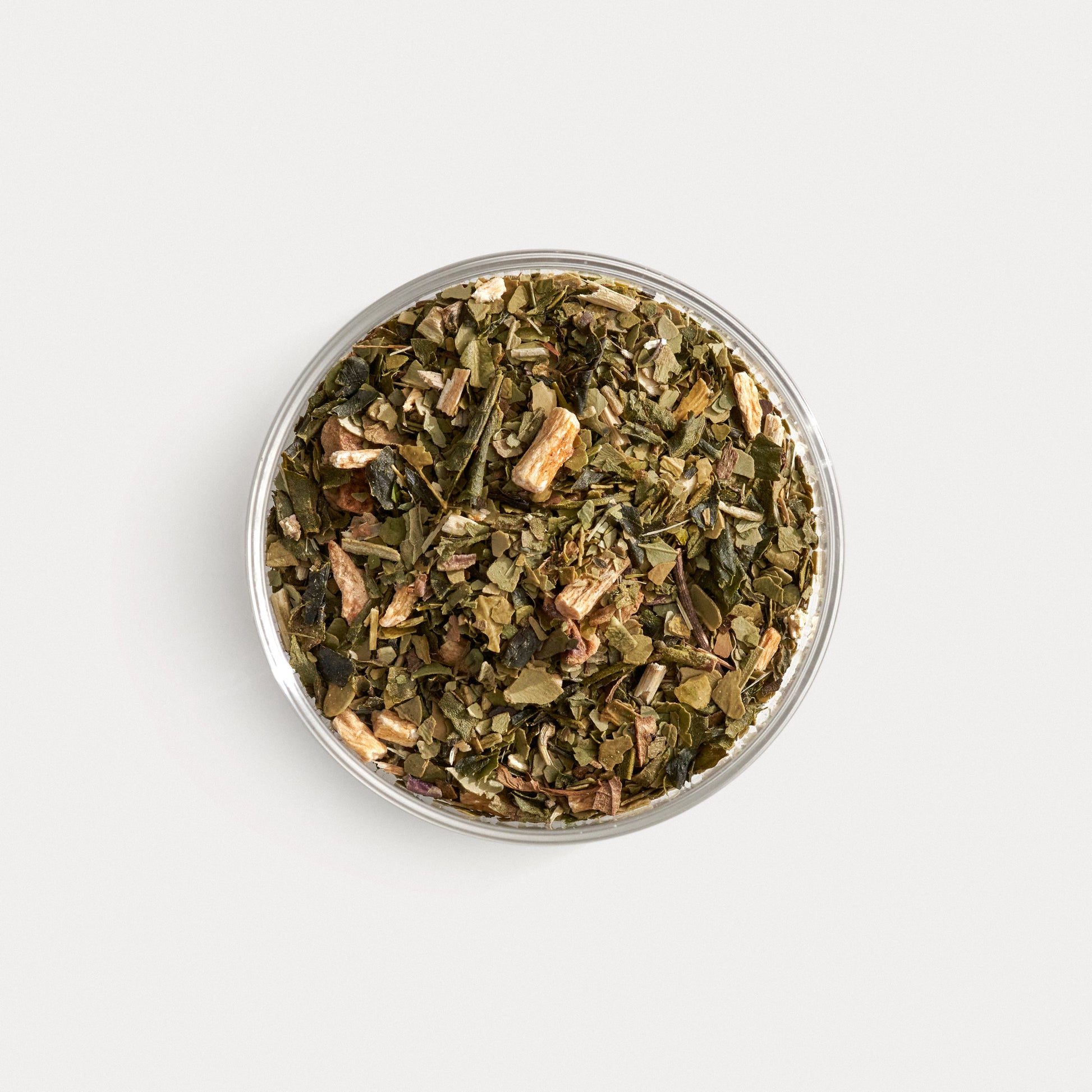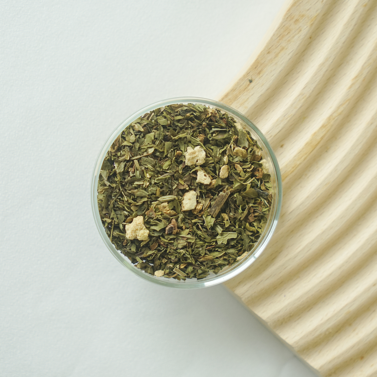 Peppermint Leaves, Spearmint Leaves, Ginger Root, Bitter Orange Peels, Sweet Fennel, Moringa Leaf, Anise, Liquorice Root, Sweet Basil Leaves, and Natural Flavourings.