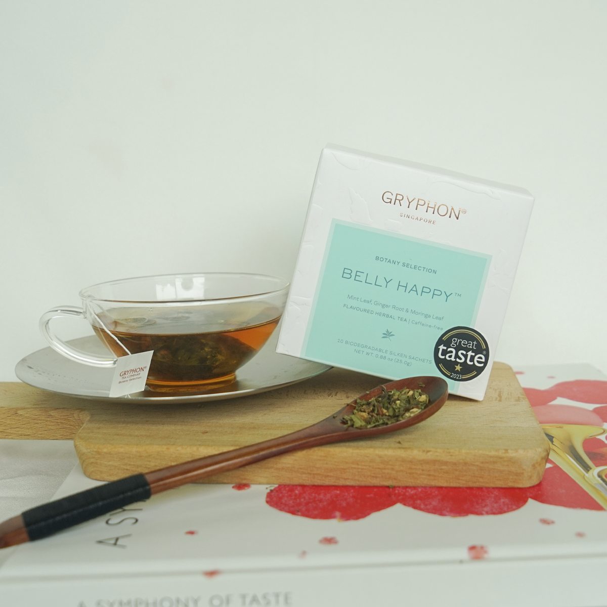 Peppermint oil is traditionally used as a remedy for indigestion and irritable bowel syndrome. Gryphon Tea's Belly Happy is a blend of naturally caffeine-free herbs with Mint Leaves, Ginger, Sweet Fennel, and Nutmeg Flowers to help alleviate associated syndrome from stomach acids.