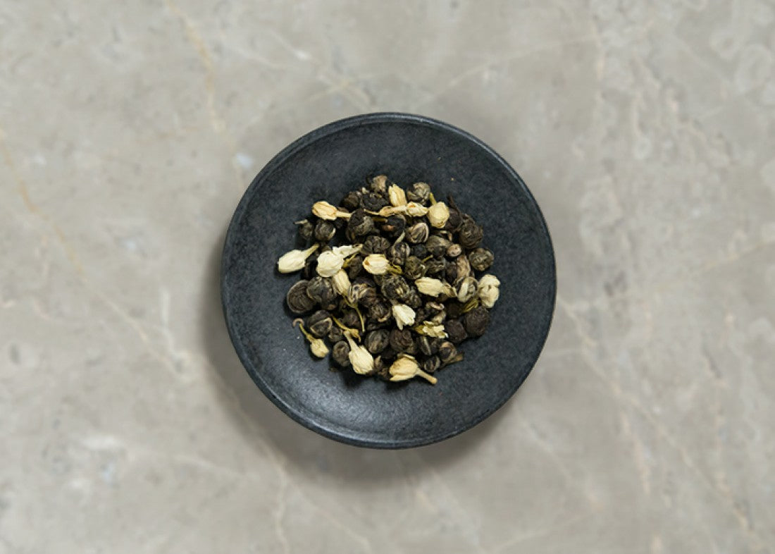 Handcrafted in Fujian Province, silvery-green leaves are rolled into delicate pearls and scented with fresh jasmine blossoms. The result is a tea of exquisite grace, where floral perfume intertwines with verdant sweetness and a whisper of honey.