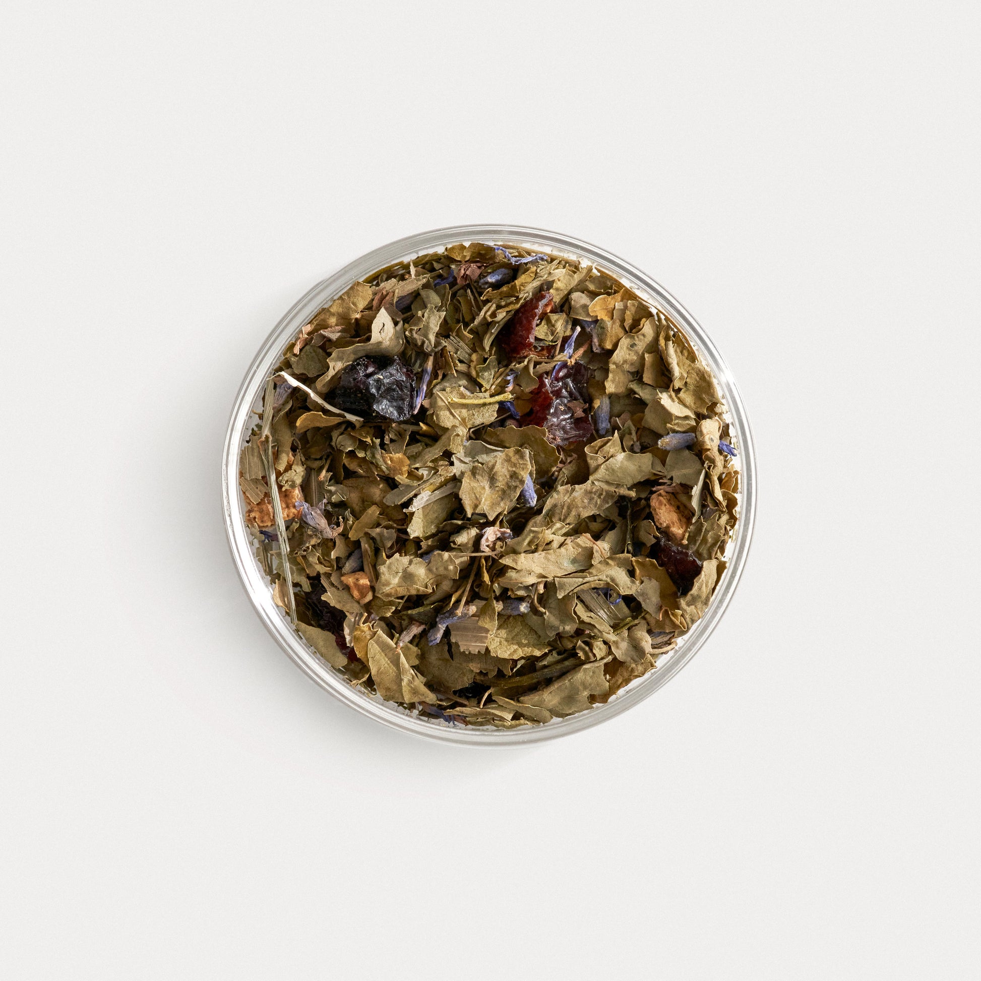 Moringa Leaves, GABA Green Tea, Cassis Fruit, Orange Peels, Rose Hips, Spearmint Leaves, Lavender Flowers, Blackcurrant Leaves, Mulberry Leaves, Sweet Fennel, Blue Cornflowers, and Natural Flavourings.