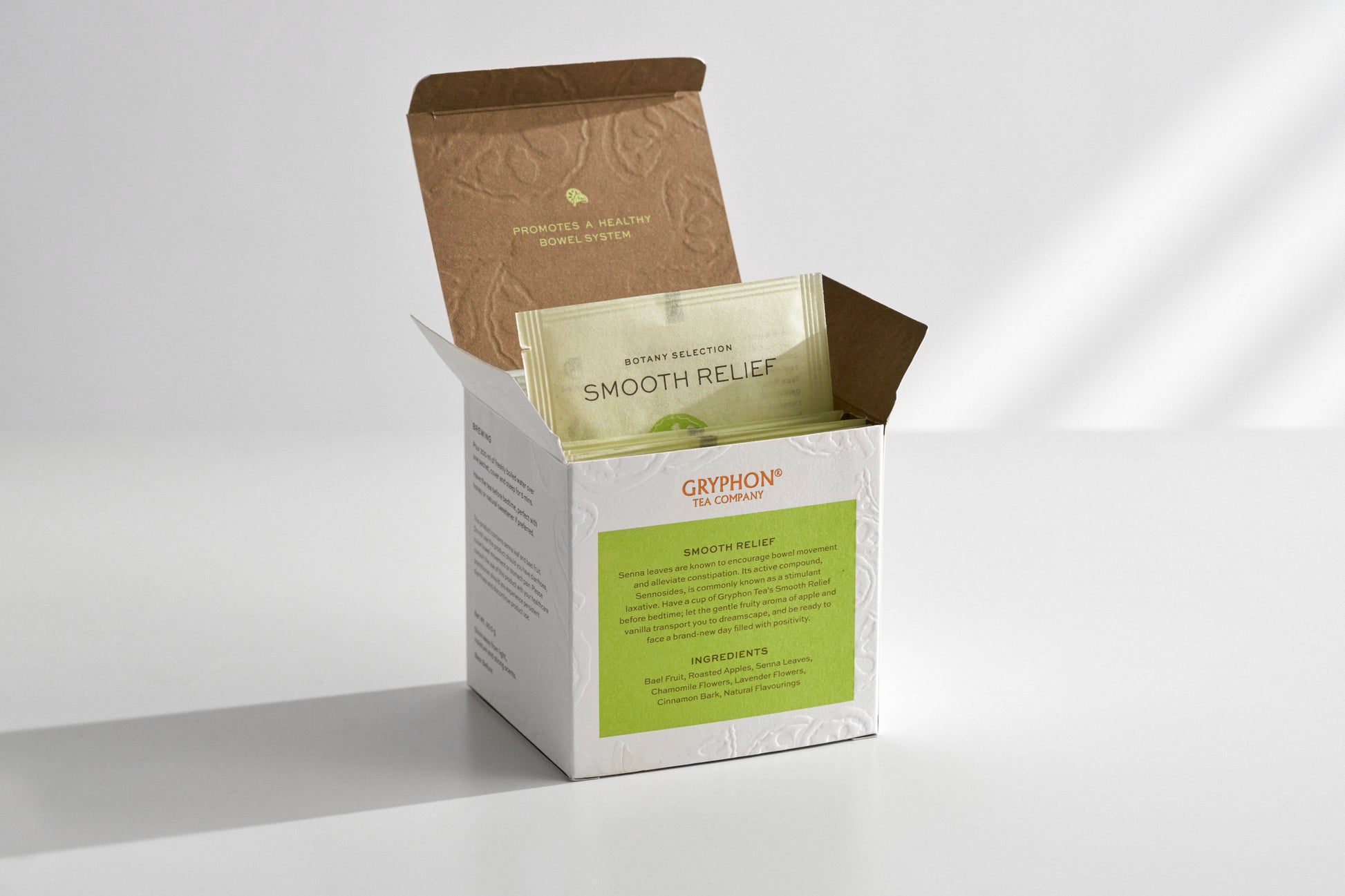 Promotes a Healthy Bowel System Senna leaves are known to encourage bowel movement and alleviate constipation. Its active compound, Sennosides, is commonly known as a stimulant laxative. Have a cup of Gryphon Tea's Smooth Relief before bedtime; let the gentle fruity aroma of Apple and Vanilla transport you to dreamscap