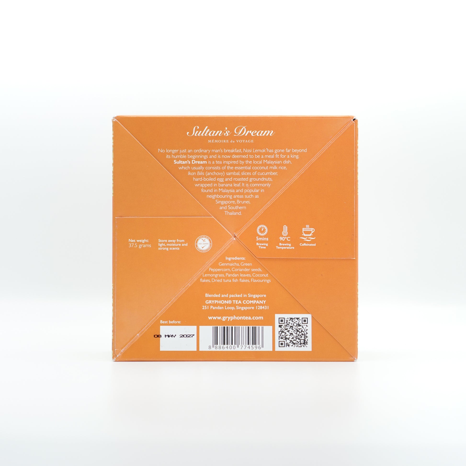 No longer just an ordinary man's breakfast. Nasi Lemak has gone far beyond its humble beginnings and is now deemed to be a meal fit for a king. Sultan's Dream is a tea inspired by the local Malaysian dish usually consists of the essential coconut milk rice, Ikan Bilis (anchovy) sambal, slices of cucumber, hard-boiled egg and roasted groundnuts, wrapped in banana leaf. It is commonly found in Malaysia and popular in neighbouring areas such as Singapore, Brunei, and Southern Thailand. 15 sachets in a box.