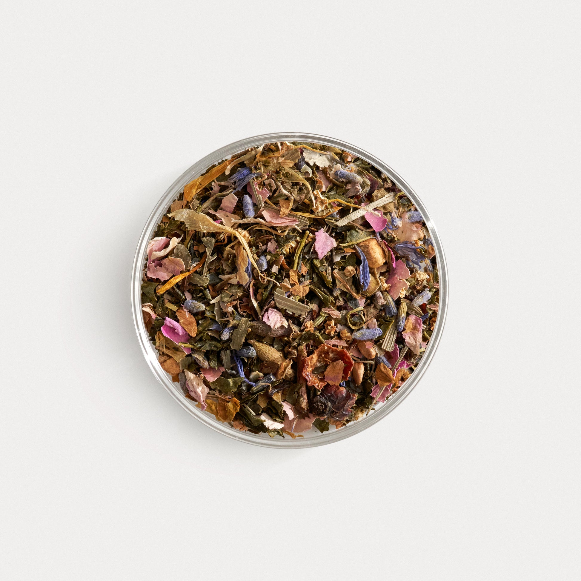 GABA Green Tea, Pink Rose Petals, Rose Hips, Lavender Flowers, Lemon Balm, Mulberry Leaves, Sweet Fennel, Pink Cornflowers, Marigold Flowers, and Natural Flavourings