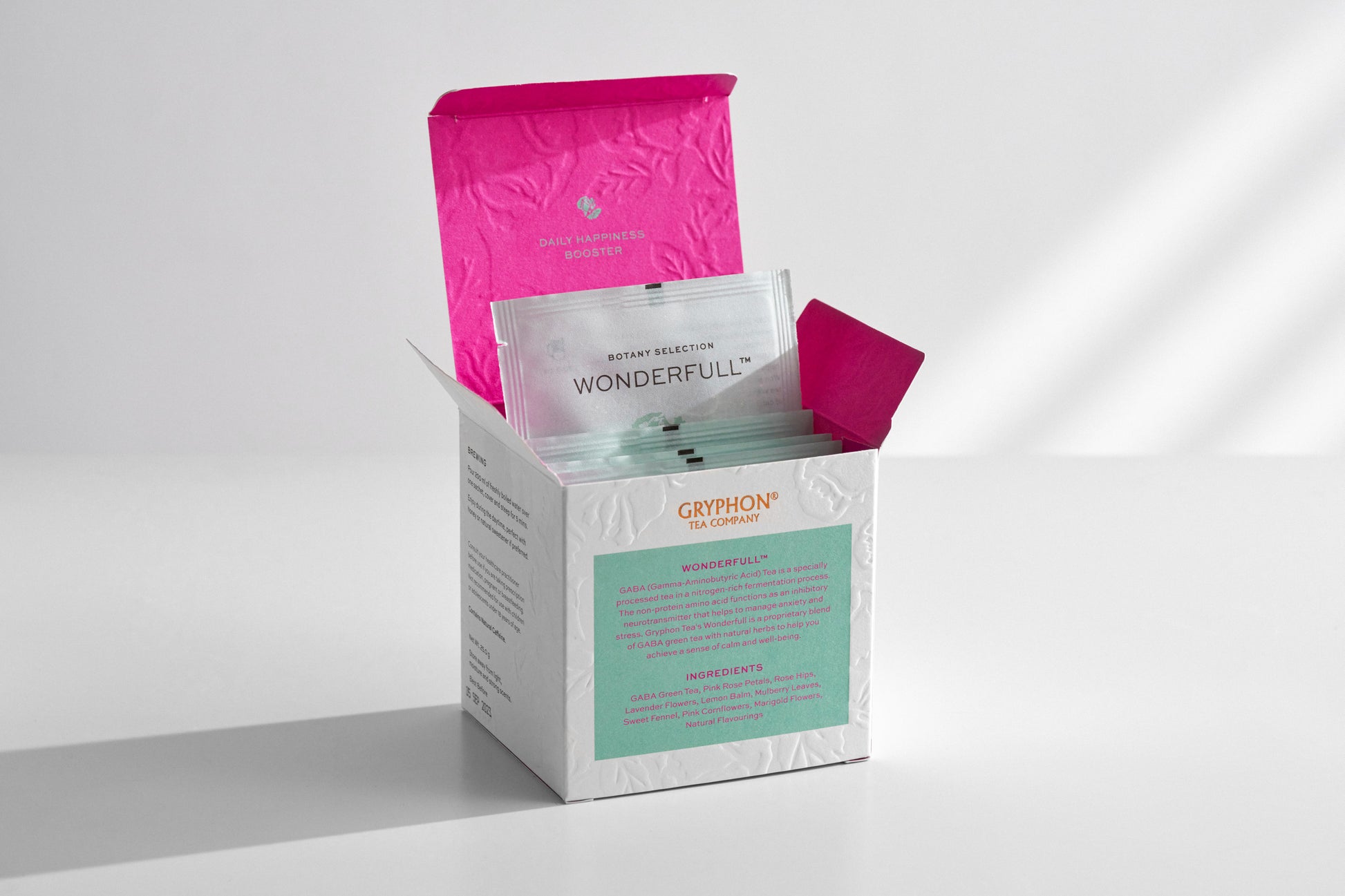 Daily Happiness Booster GABA (Gamma-Aminobutyric Acid) Tea is a specially processed tea in a nitrogen-rich fermentation process. The non-protein amino acid functions as an inhibitory neurotransmitter that helps to manage anxiety and stress. Gryphon Tea's Wonderfull is a proprietary blend of GABA green tea with natural